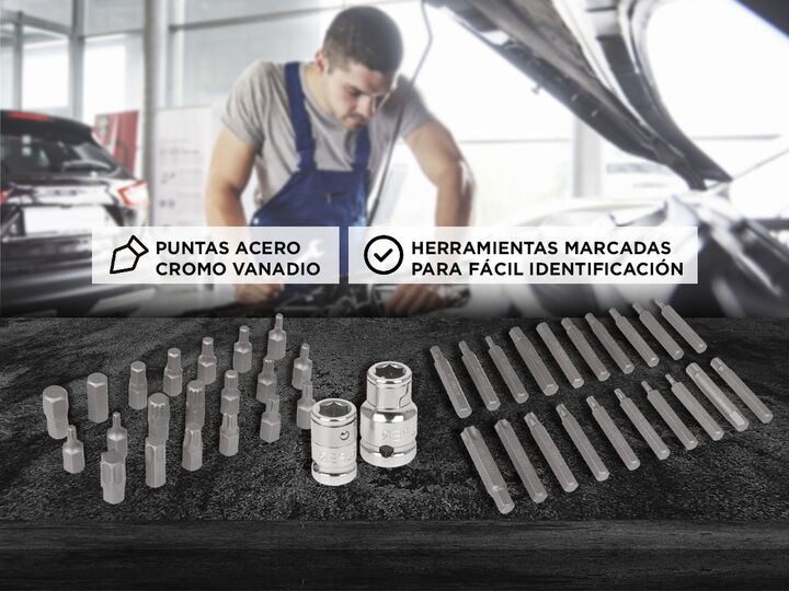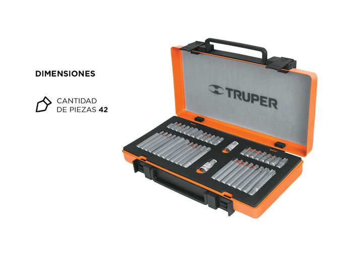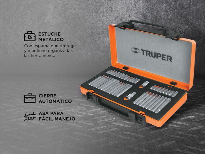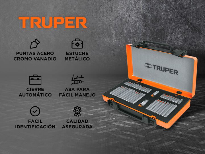 Truper: Herramientas con la mejor Calidad - Precio Especificaciones Puntas en acero al cromo vanadio Estuche metálico con espuma que protege y mantiene organizadas las herramientas Broches de cierre automático Asa para fácil manejo Herramienta marcada para fácil identificación