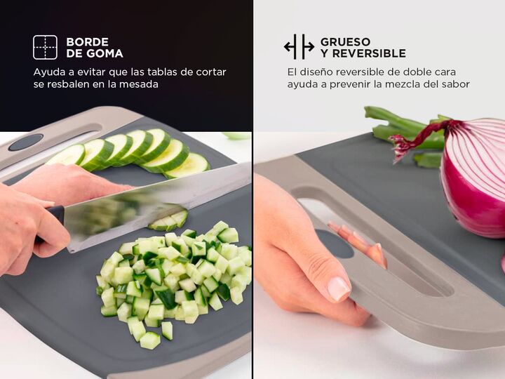 Gadnic by Cuk presenta el nuevo Set x3 tablas de picar antideslizantes: Antibacteriana: Fabricadas con materiales que inhiben el crecimiento de bacterias, garantizando una superficie más higiénica para cortar alimentos. Antideslizante: Equipadas con patas de goma en las esquinas para evitar que la t...