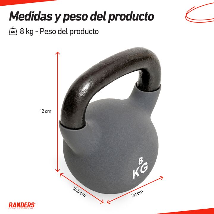 Dale variedad a tu entrenamiento con la Kettlebell ARG-NKET-008 de 8 kg. Confeccionada en fundición y recubierta con neoprene de primera calidad, esta pesa rusa importada ofrece durabilidad y un agarre cómodo para cada ejercicio. Su diseño ergonómico permite movimientos fluidos y seguros, ideal tant...