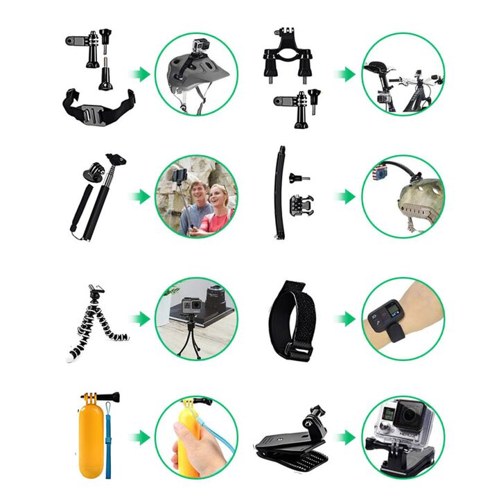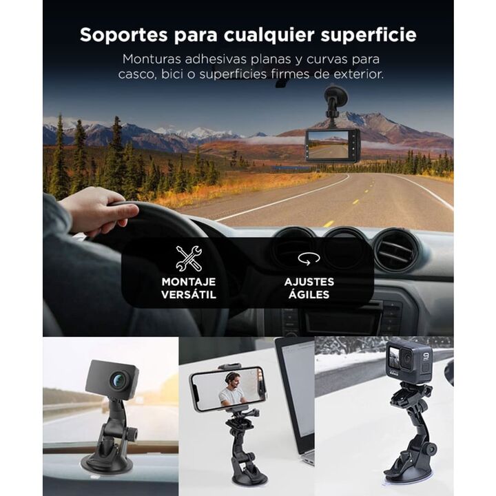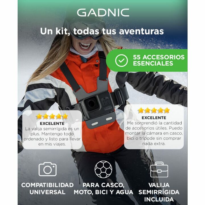55 accesorios para múltiples deportes: El Kit Gadnic MCDEP022 ofrece una variedad completa de soportes y correas para capturar tus aventuras en moto, bici, casco o auto. Su amplitud de piezas permite adaptarse a distintos entornos y estilos de uso sin limitaciones. Compatibilidad universal con cámar...