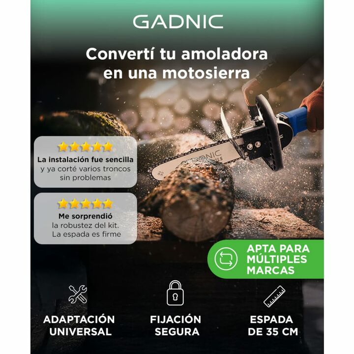 Nuevo kit de adaptación para sierras By Gadnic Este producto puede montar la cadena en amoladora angular y convertir la amoladora angular en una motosierra eléctrica. Los accesorios te permitirán convertir tu herramienta de forma segura y sencilla. Materiales de alta calidad y certificados La placa ...