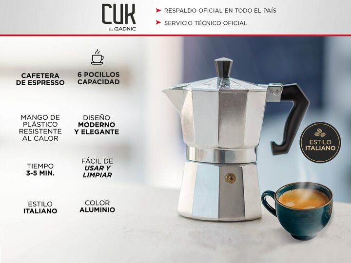 Descubre la deliciosa experiencia del café con la Cafetera de Aluminio Gadnic de 6 pocillos, diseñada para preparar espresso de alta calidad. Este café especial se elabora forzando pequeñas cantidades de agua casi hirviendo bajo presión a través de granos de café finamente molidos, resultando en una...