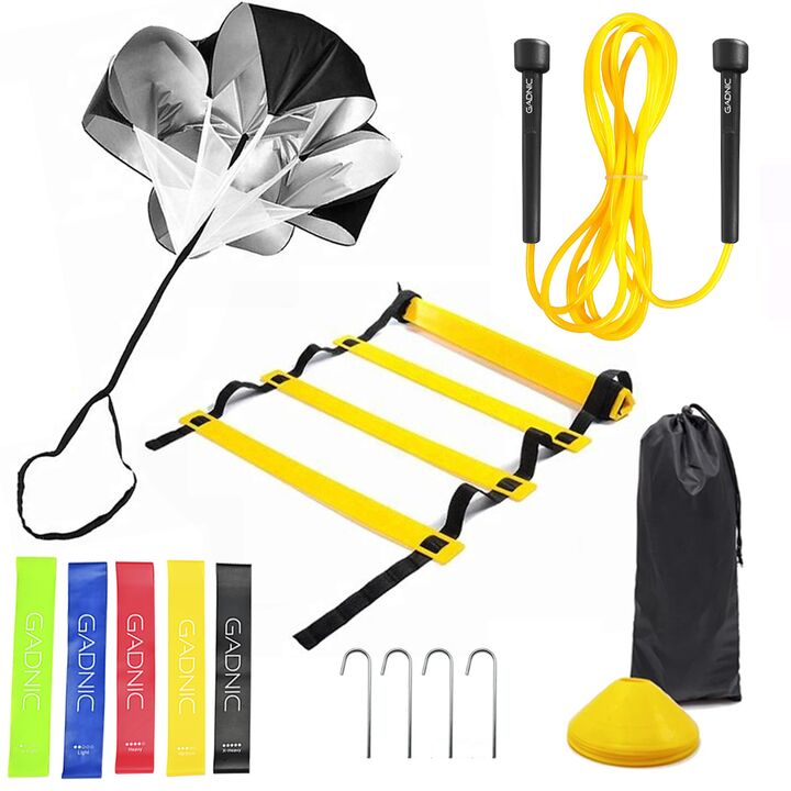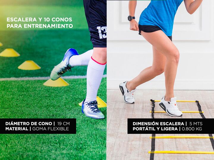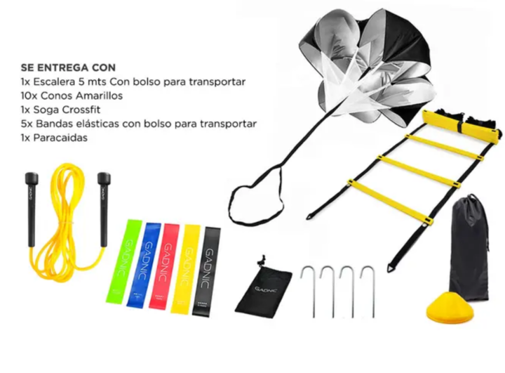 El Kit de entrenamiento Gadnic: Banda Latex + 10 Conos + Escalera Fitness + Soga Crossfit es un conjunto de herramientas de entrenamiento ideales para aumentar su velocidad, fuerza y agilidad. Con este kit podrás realizar muchos ejercicios los cuales te podrán fortalecer varias zonas del cuerpo. Est...