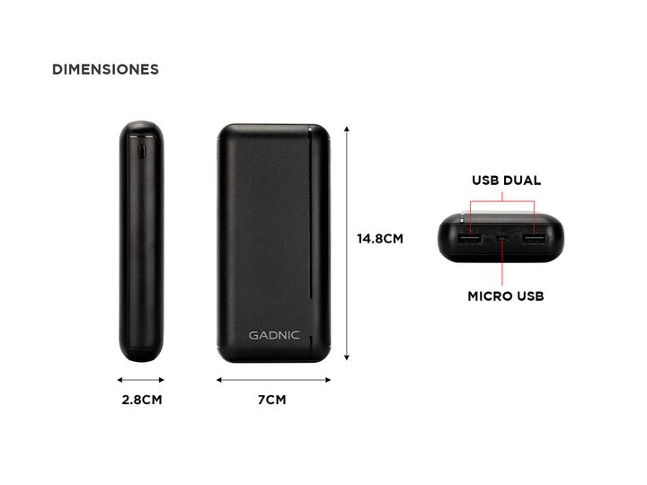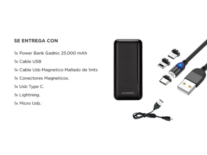¡GADNIC presenta su última generación de Cargadores portátiles! Este power bank ofrece una alta capacidad de carga de 25.000mAh a través de dos puertos usb. Cargue su smartphone y tablet de forma simultánea y rápida. Posee una enorme capacidad de carga de 25.000mAh, además ¡y ademas, tiene carga RÁP...