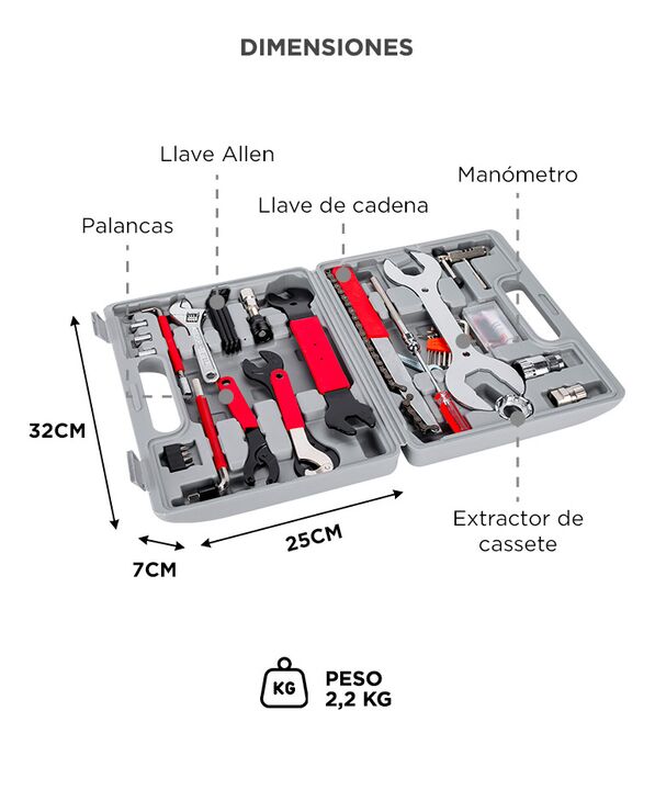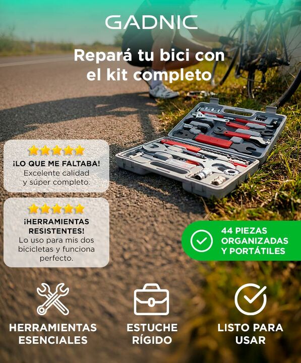 Mantenimiento completo para bicicletas El kit de herramientas Gadnic de 44 piezas esta pensado para realizar tareas completas de mantenimiento en bicicletas. Permite ajustar desmontar y reparar componentes clave del sistema de transmision ruedas y ejes. Incluye herramientas especificas para piñon ca...