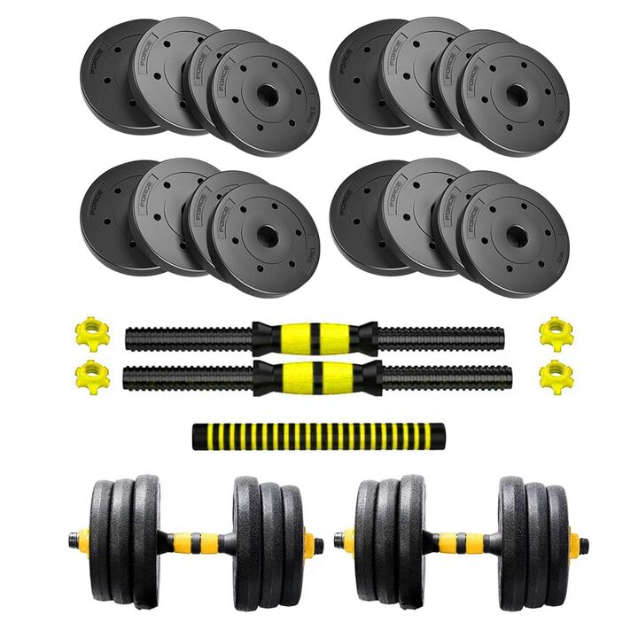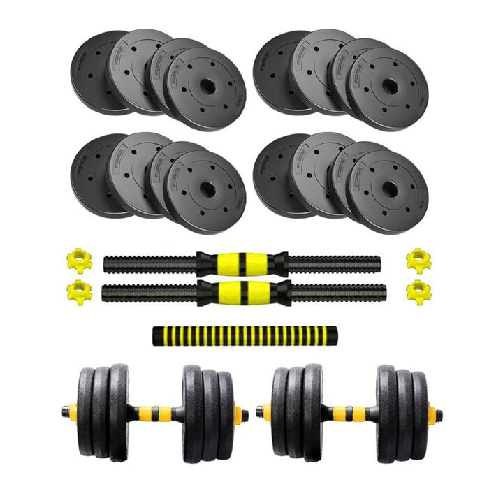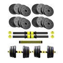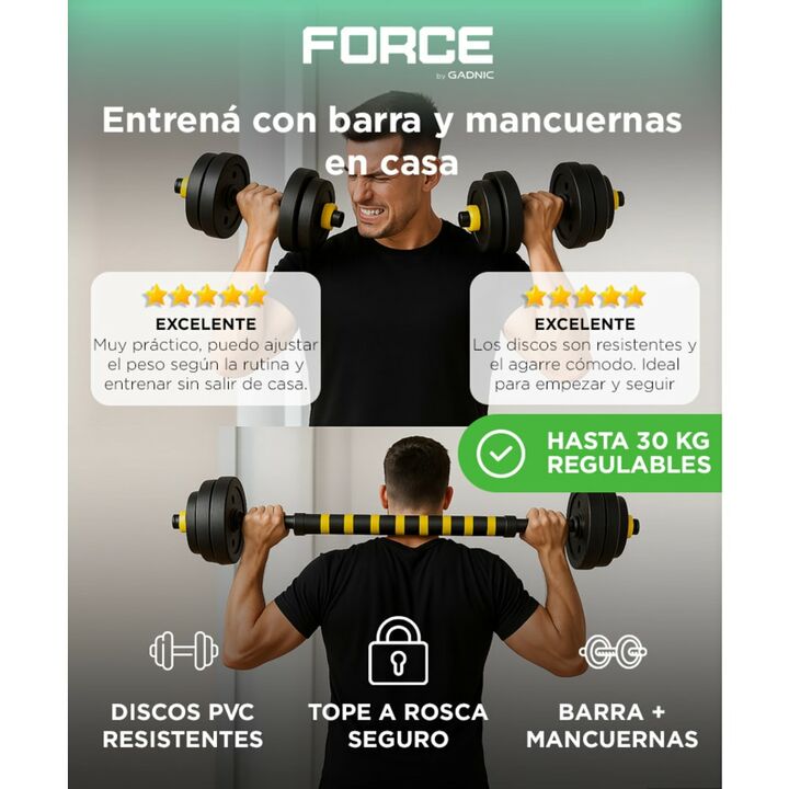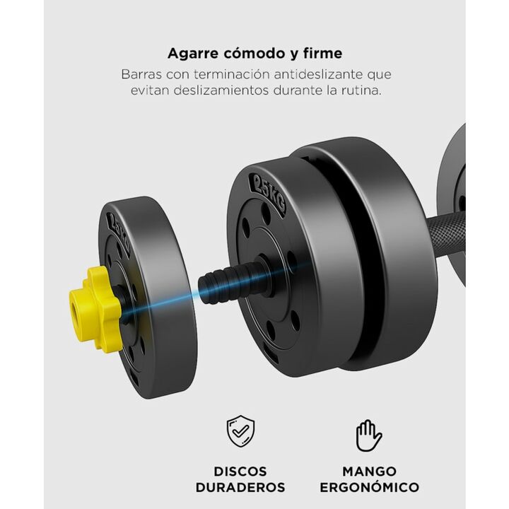 Entrenamiento completo en casa: incluye barra y mancuernas regulables para ejercitar todo el cuerpo. Hasta 30 kg ajustables: combiná discos de PVC intercambiables para lograr la carga ideal. Diseño seguro y confiable: topes a rosca firmes que evitan movimientos de los discos durante el uso. Mayor co...