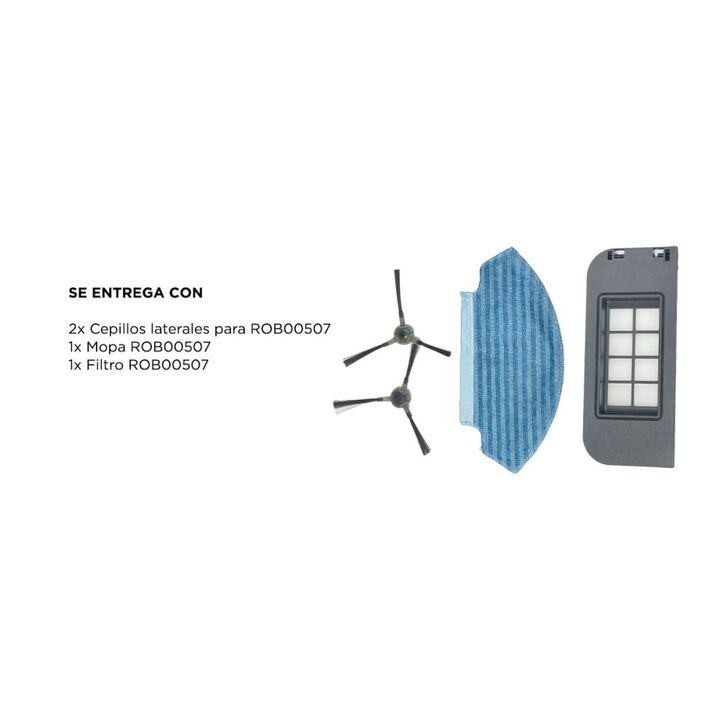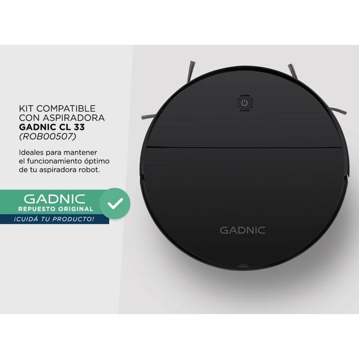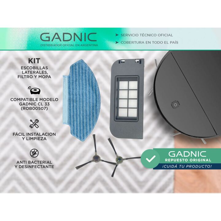 Kit de Repuestos Originales GADNIC Aspiradora ROB00507 Kit súper completo para tu aspiradora de confianza. Especificaciones Mopa lavable Cepillos laterales Filtro Repuestos originales Modelo Compatible: ROB00507 Garantía: 12 meses