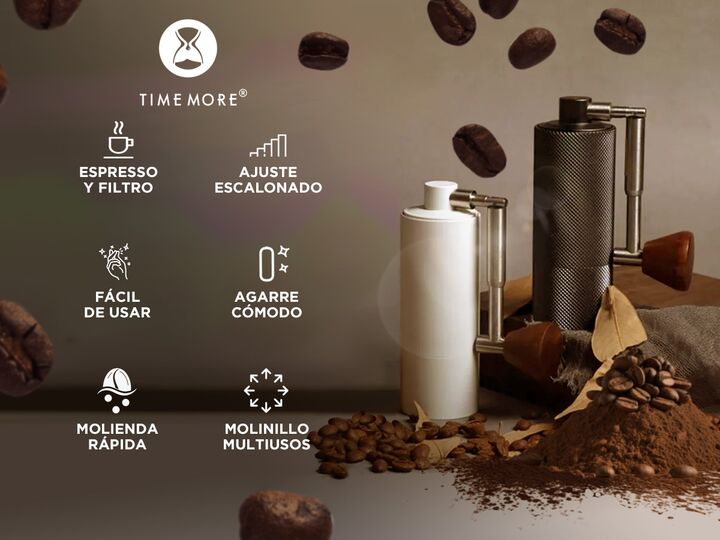 Especificaciones Molinillo de Café Timemore Manual Capacidad: 20-25g Configuraciones de molienda: 35 (cerveza turca a fría+) Materiales: Aluminio, Acero, Silicona Cuerpo y refuerzo: Aluminio fresado de 1 pieza Capacidad para: Espresso y filtro Ajuste de molienda: Escalonado Cuerpo texturizado: Para ...