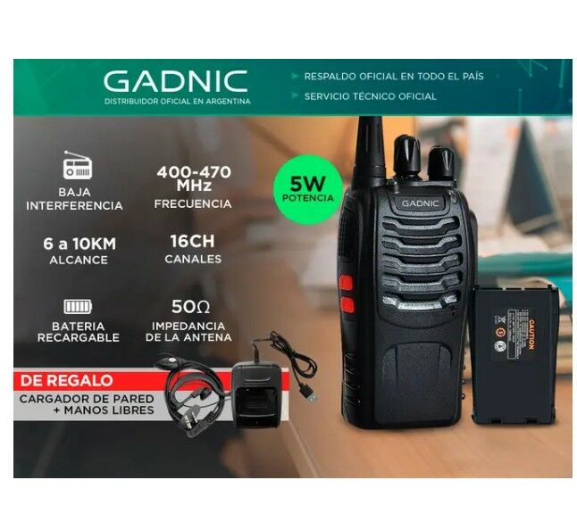 Especificaciones Handy Gadnic WK99U 5w 16CH UHF Hasta 10km + Manos Libres - WALKIE20 Rango de frecuencia UHF 400-470MHz Canal Capacidad 16 Separación entre canales 25KHz Tensión Operado 3.7 V Batería H – 1800mAh Li -ion Duración de la batería (5/5/90 ciclo de trabajo) Cerca de 8 horas Estabilidad de...