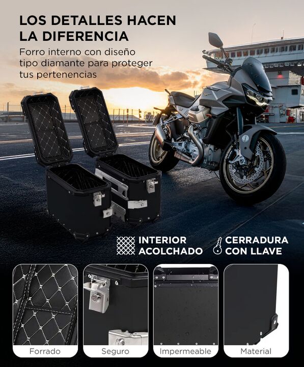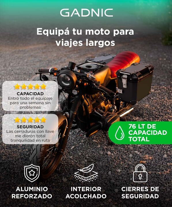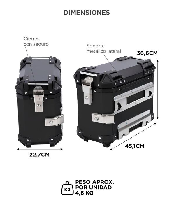 Capacidad Y Practicidad Para Viajes El kit de baules laterales Vetra ofrece 38 litros de capacidad por unidad permitiendo transportar equipaje y accesorios con comodidad. Son adecuados para viajes largos y trayectos en ruta. Su formato lateral optimiza distribucion del peso en la motocicleta. Permit...