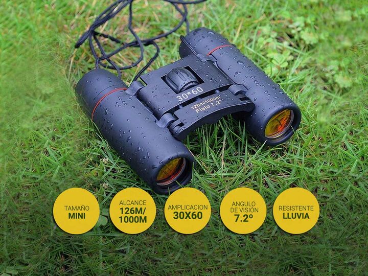 Especificaciones Mini Binocular Ampliación: 30x60 Campo: 7,2 ° Alcance: 126m / 1000m Diámetro de la lente: Aprox. 2.3cm / 0.9in Tamaño doblado: Aprox. 9 * 6 * 4cm (3.5 * 2.4 * 1.6in) Tamaño Desplegado: 9 * 10.5 * 4 cm (3.5 * 4.1 * 1.6in) Peso del artículo: 163g / 5,7 oz Tamaño del paquete: 11 * 8 * ...