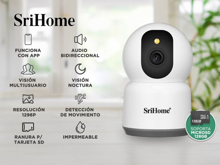 Especificaciones Cámara de Seguridad IP SriHome 4MP Wifi 5g 2.4g - P2PSRI03 FHD: 5MP, 1920P (2560 * 1920), inteligente H.265 Audio: Micrófono y altavoz integrados, compatible con audio bidireccional PTZ: panorámica: 355, inclinación: 70, zoom digital 3x Lente: lente de 4 mm, rango IR de hasta 10 m V...