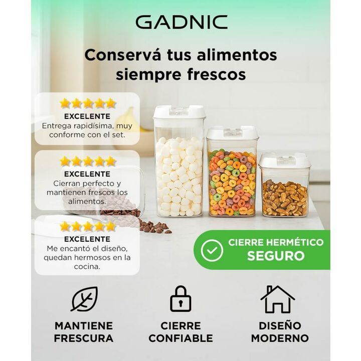 Los recipientes transparentes Gadnic son la opción ideal para identificar el contenido de un vistazo. Fabricados con material de alta calidad y libre de BPA, garantizan durabilidad y seguridad en el almacenamiento de tus alimentos. El plástico de estos recipientes es excepcionalmente claro, permitie...