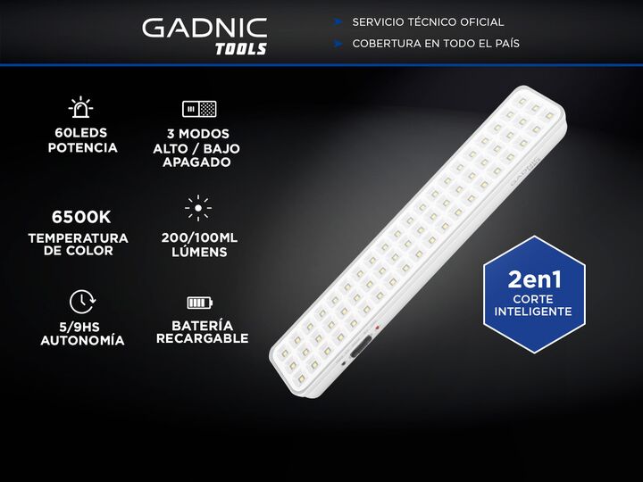 ¡GADNIC Tools lanza su nueva línea de Luces de Emergencia! Son prácticas, versátiles y de alta calidad. ¡Descubrí nuestras luces más innovadoras, ideales para la oficina, el hogar, el camping y mucho más! Especificaciones Color: 6500K Potencia Nominal: 3.2 W Tensión: 220V Batería: 3,7V / 1800 mAh Ti...