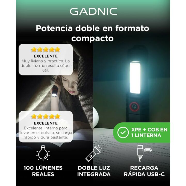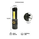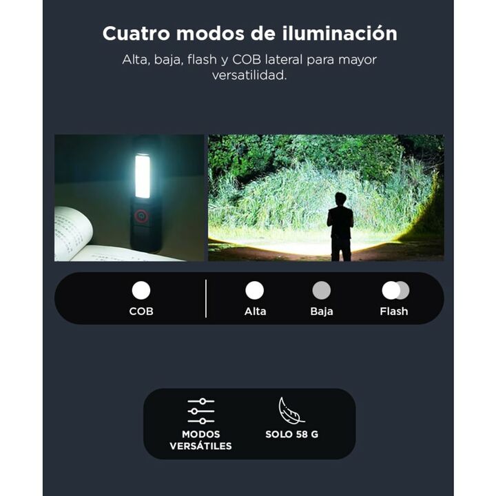 Doble luz integrada: Combiná LED XPE frontal y COB lateral en un mismo diseño. Perfecta para uso versátil. Cuatro modos de iluminación: Alta, baja, flash y COB 100%. Adaptá el brillo según tu necesidad. Compacta y liviana: Con solo 13 cm y menos de 60 g, es ideal para llevar en el bolsillo o mochila...
