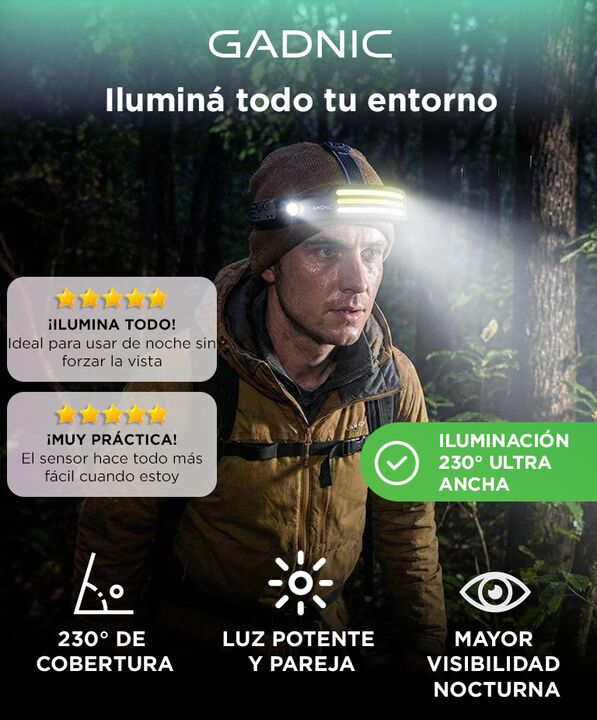 ILUMINACION FRONTAL EFICIENTE Esta linterna de cabeza Gadnic ofrece iluminacion directa alineada con la vista del usuario Permite trabajar caminar o desplazarse sin necesidad de sostener una linterna manual El LED T6 blanco genera un haz estable y uniforme Ideal para actividades nocturnas y entornos...