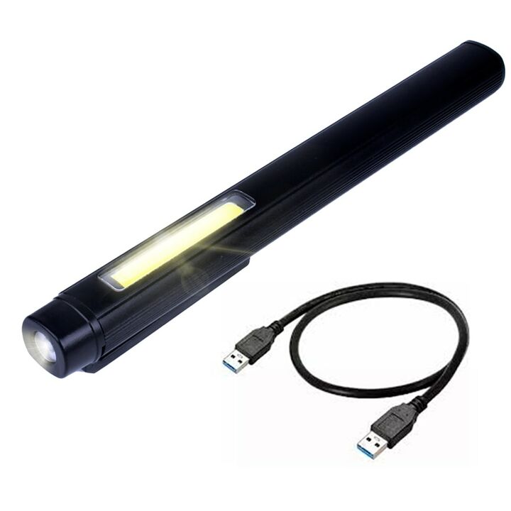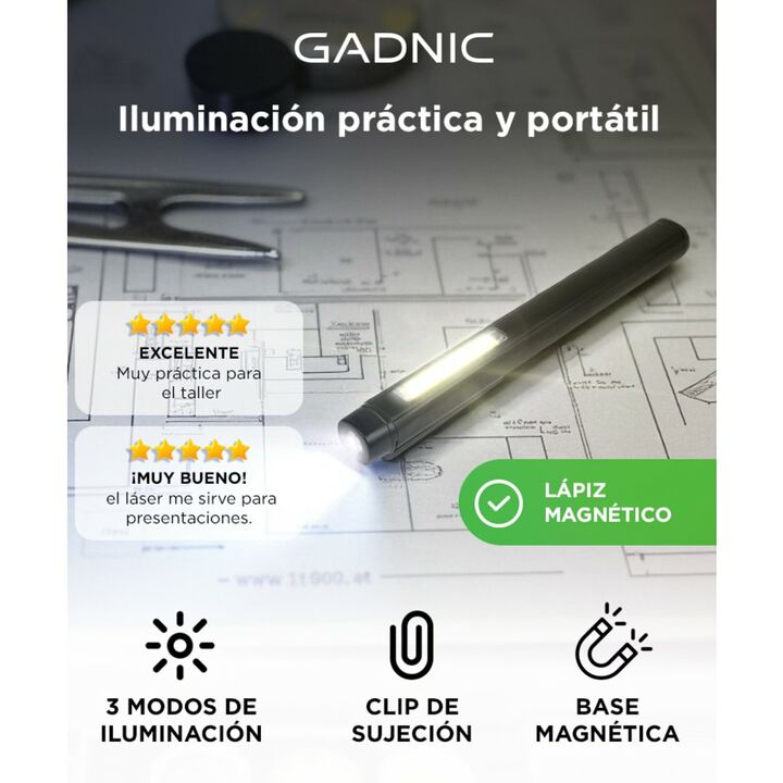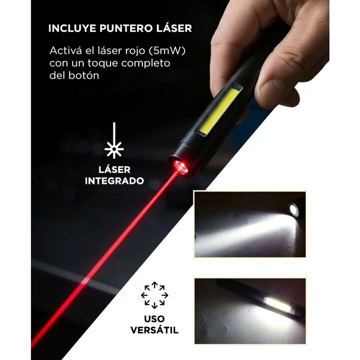Diseño práctico y portátil: Linterna tipo lápiz, liviana y compacta. Fácil de llevar en el bolsillo o sujetar con su clip. Luz COB amplia y uniforme: Ilumina superficies completas con claridad. Perfecta para oficina, taller o estudio. Tres modos de iluminación: LED inferior, COB parcial y COB comple...