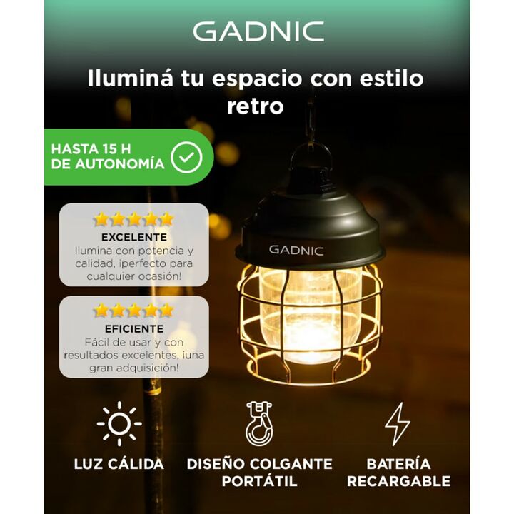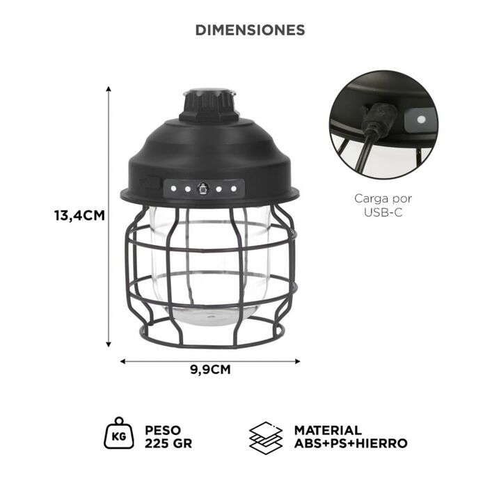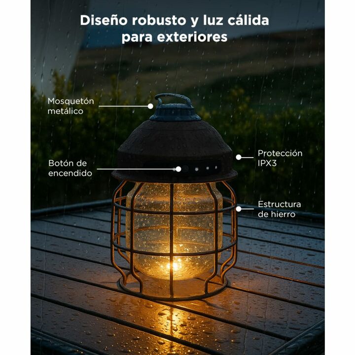 Diseño vintage y funcional: Este farol combina una estética retro con materiales resistentes, logrando un equilibrio entre decoración y utilidad. Su estructura metálica con acabado negro y forma tipo jaula lo convierte en una pieza ideal para ambientes cálidos como galerías, livings rústicos o carpa...