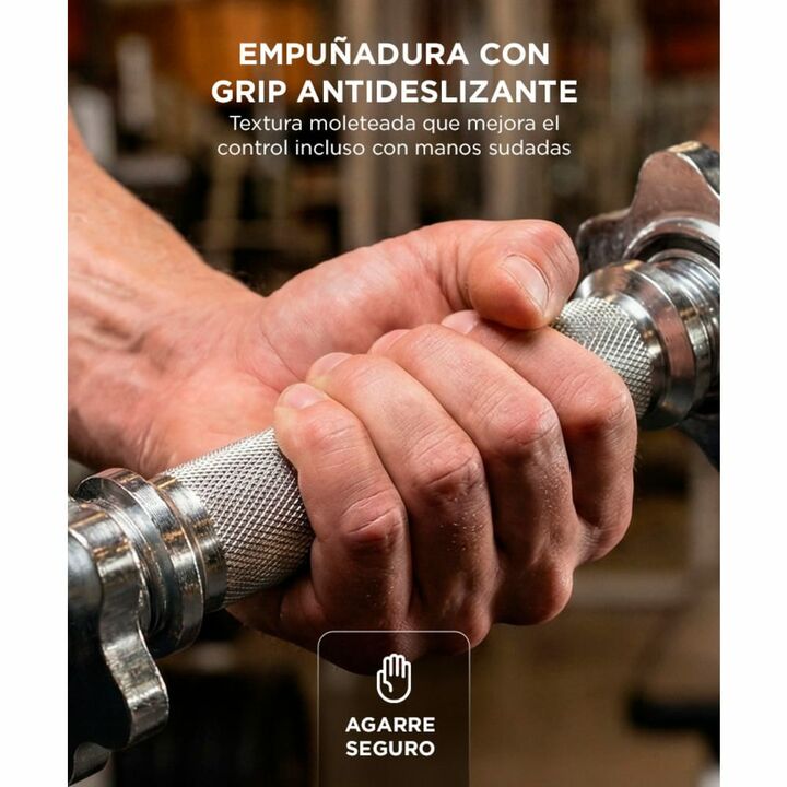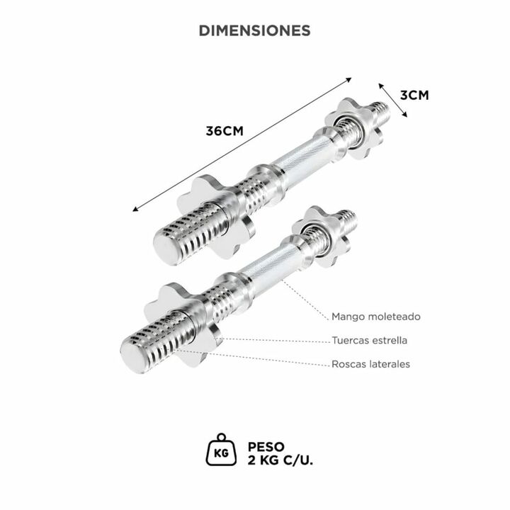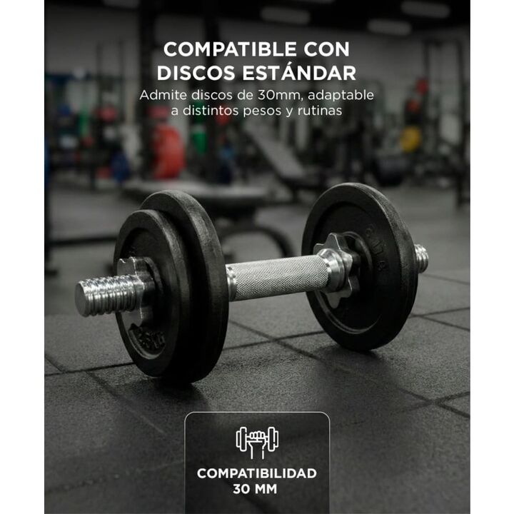 Estructura solida para entrenamiento con pesas La barra de mancuerna roscada esta diseñada para entrenamiento de fuerza con discos estandar de treinta milimetros. Su construccion en acero con terminacion cromada brinda resistencia mecanica y durabilidad. Es una solucion tecnica confiable para rutina...