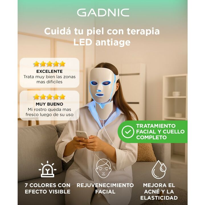 ¡Gadnic presenta su nueva linea de Mascara Led! Esta mascara es ideal para el cuidado de la piel y combatir el acné. Gracias a su gran pantalla táctil hace que sea muy fácil a la hora de usar. Cuenta con 192 luces LED y 7 diferentes colores. Dependiendo del tipo de luz elegida se pueden realizar dif...