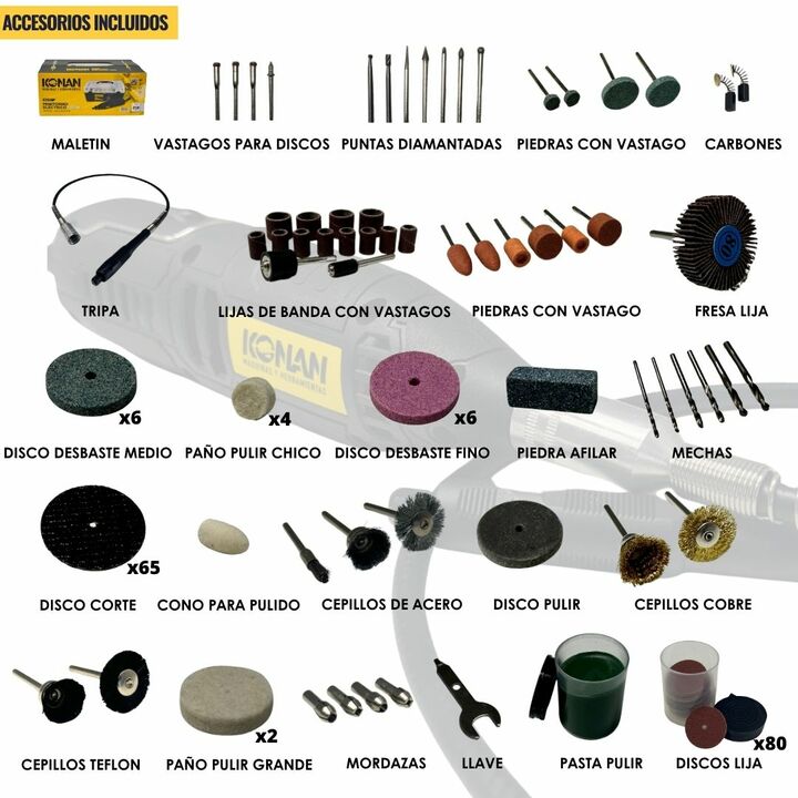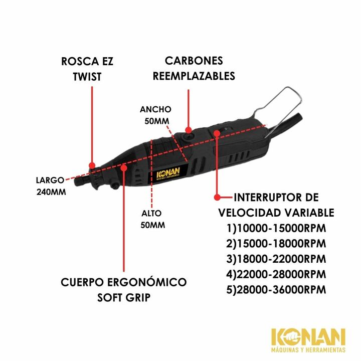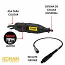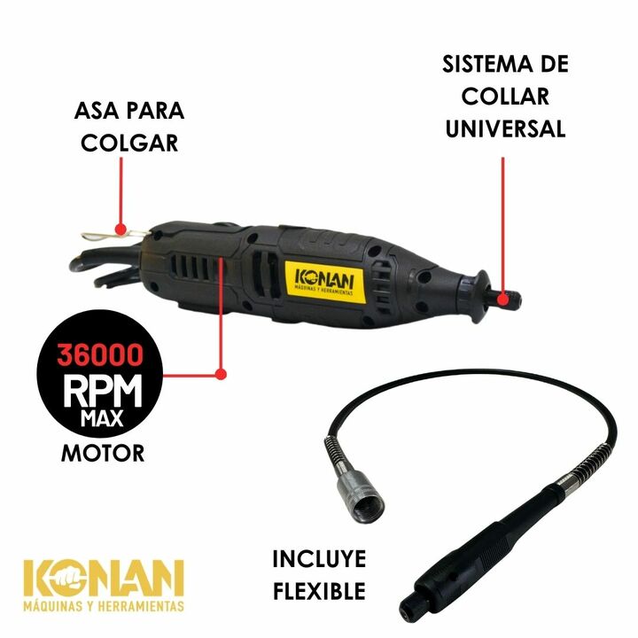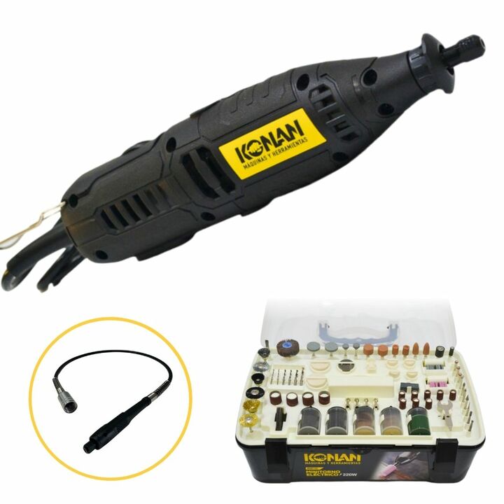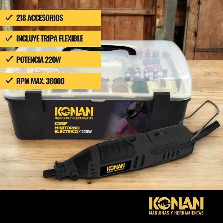 El Minitorno Eléctrico Konan de 220 W es una herramienta potente, versátil y precisa, ideal para trabajos de detalle, grabado, lijado, pulido, corte y desbaste liviano. Gracias a su mayor potencia, permite un rendimiento superior frente a modelos más chicos, manten...
