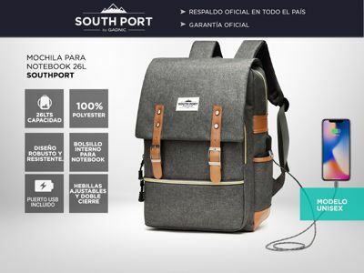 Especificaciones de la mochila SOUTHPORT para Notebook Material del revestimiento: Poliéster Tipo de Mochilas: Libro de papel Tipo de cierre: Cremallera & pestillo Compartimiento interior Notebook Puerto USB incluido Capacidad 26L Medidas: 39cmx26cm18cm Género Unisex Ideal para Notebooks Costuras re...