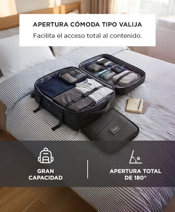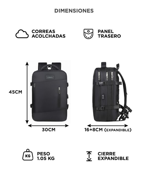 Capacidad expandible para adaptarse a cada viaje: La Mochila de Viaje Negra Southport by Gadnic permite ampliar su profundidad hasta 8 cm adicionales, ofreciendo mayor espacio cuando lo necesitás sin cambiar de bolso. Ideal para escapadas, viajes cortos o uso diario. Medidas ideales para equipaje de...