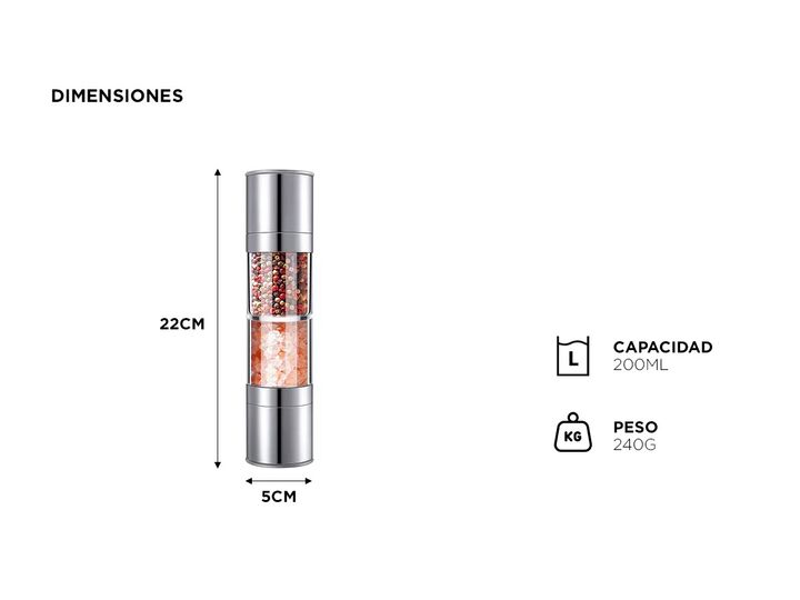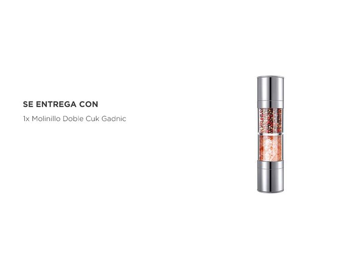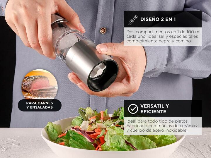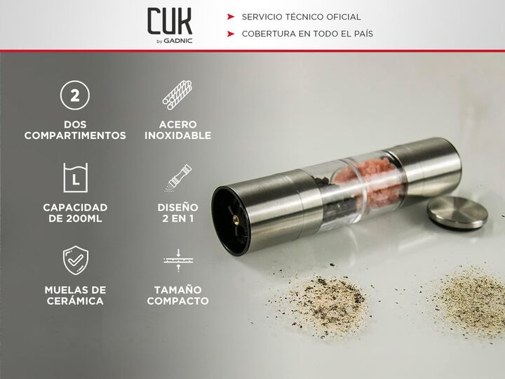 Nuevo Pimentero doble capacidad Cuk by Gadnic Añadí un toque de sofisticación a tu cocina con nuestro Molinillo Inoxidable 2 en 1 para Sal Gruesa, Pimienta y Especias. Diseñado para los amantes de la buena cocina, este molinillo combina elegancia y funcionalidad en un solo producto. Con materiales d...