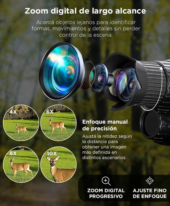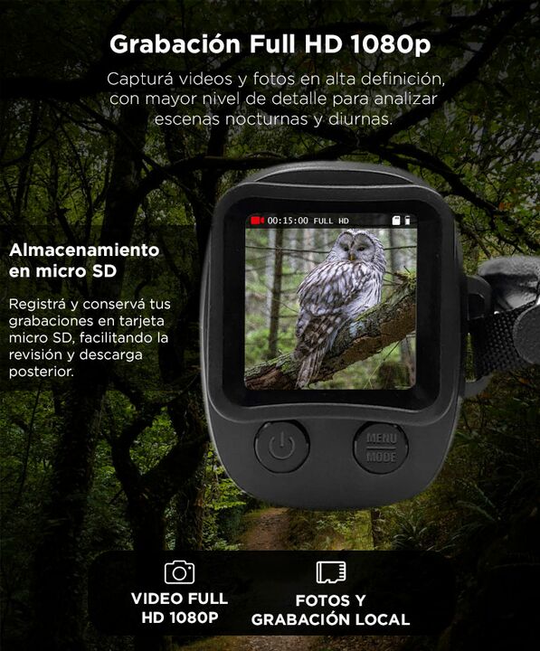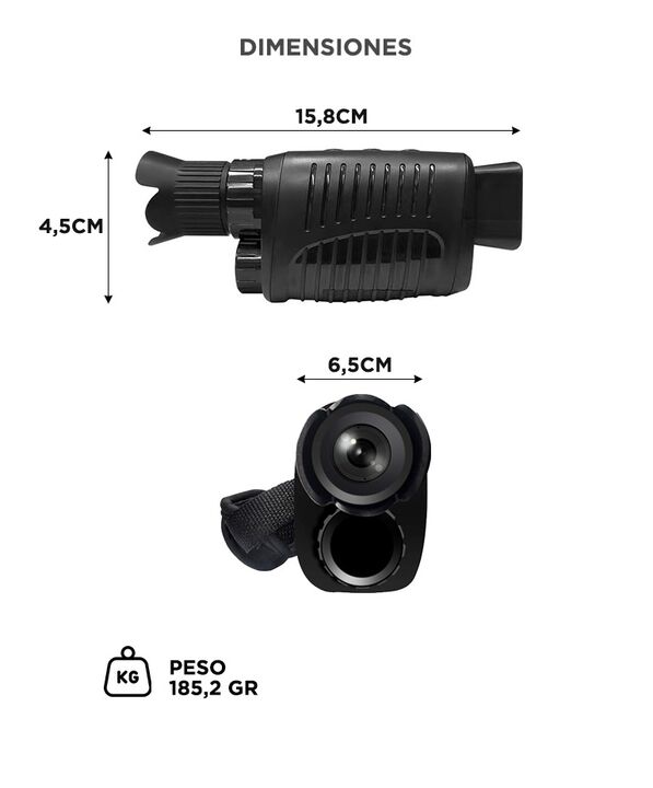 VISION NOCTURNA AVANZADA Este monocular permite observar y grabar imagenes en completa oscuridad gracias a su sistema infrarrojo integrado. El ajuste de intensidad IR mejora la visibilidad segun la distancia y condiciones del entorno Es apto para uso nocturno y diurno con cambio automatico de imagen...
