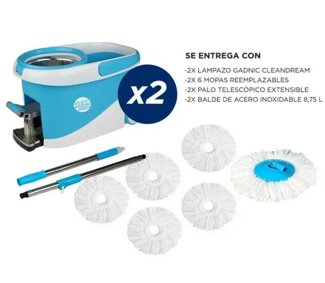 Especificaciones Mopa 100% microfibra Vara de acero Pedal para función centrifuga Capacidad del balde: 8,75 L Mínima extensión de vara: 95cm Máxima extensión de vara: 125cm Rotación 360 grados Multi Superficie Larga vida útil de pedal Balde con ruedas y agarradera Mopas lavables. Aptas para lavarrop...