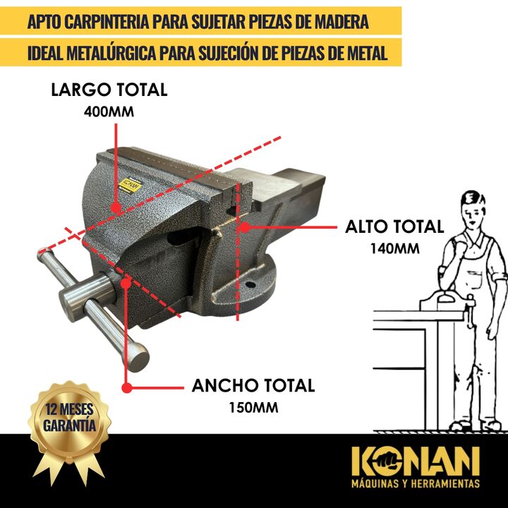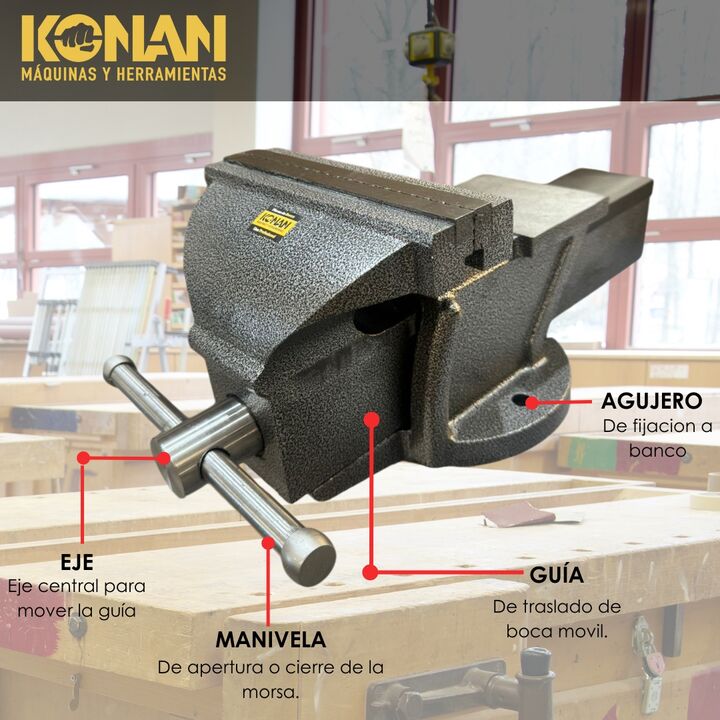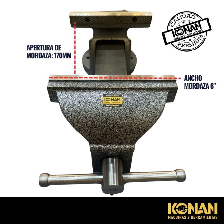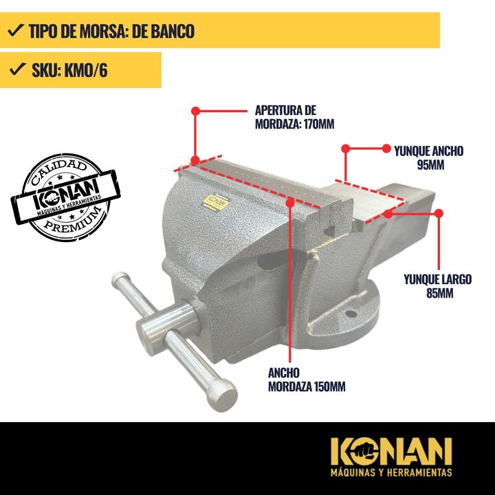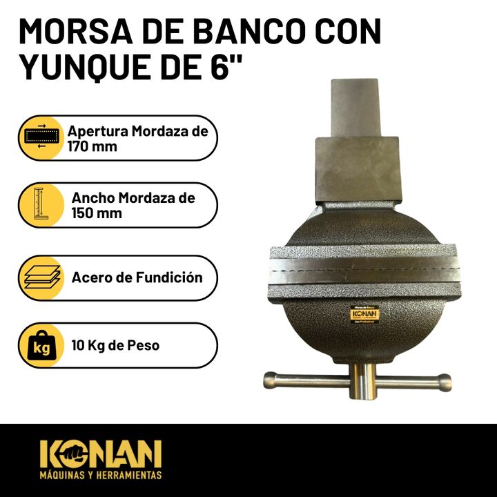 La Morsa de Banco Konan de 6 pulgadas con yunque está diseñada para trabajos pesados y exigentes, ofreciendo una sujeción extremadamente firme y una estructura sólida y reforzada. Es ideal para talleres mecánicos, herrería y uso profesional intensivo.