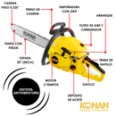 La Motosierra Konan 3.0 HP está diseñada para ofrecer potencia, rendimiento y confiabilidad en tareas de corte exigentes. Equipada con un motor a explosión de alto rendimiento, desarrolla 3.0 HP (2.2 kW) y alcanza 7000 RPM, garantizando cortes rápidos, precisos y eficientes.