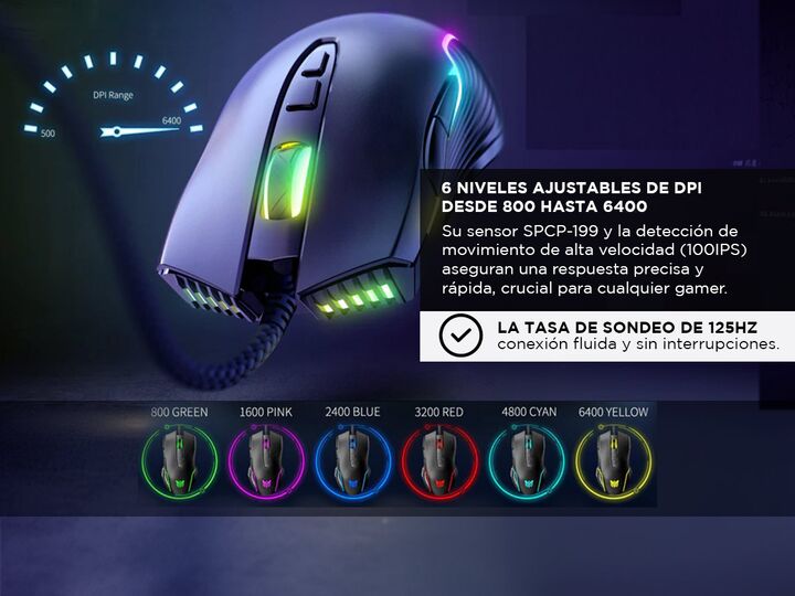¡Lleva tu experiencia de juego al siguiente nivel con nuestro Mouse Gamer! Diseñado para satisfacer las necesidades de los jugadores más exigentes, este mouse ofrece precisión y rapidez con su sensor SPCP-199 y detección de movimiento de alta velocidad de hasta 100IPS. Con un rango de PPP ajustable ...