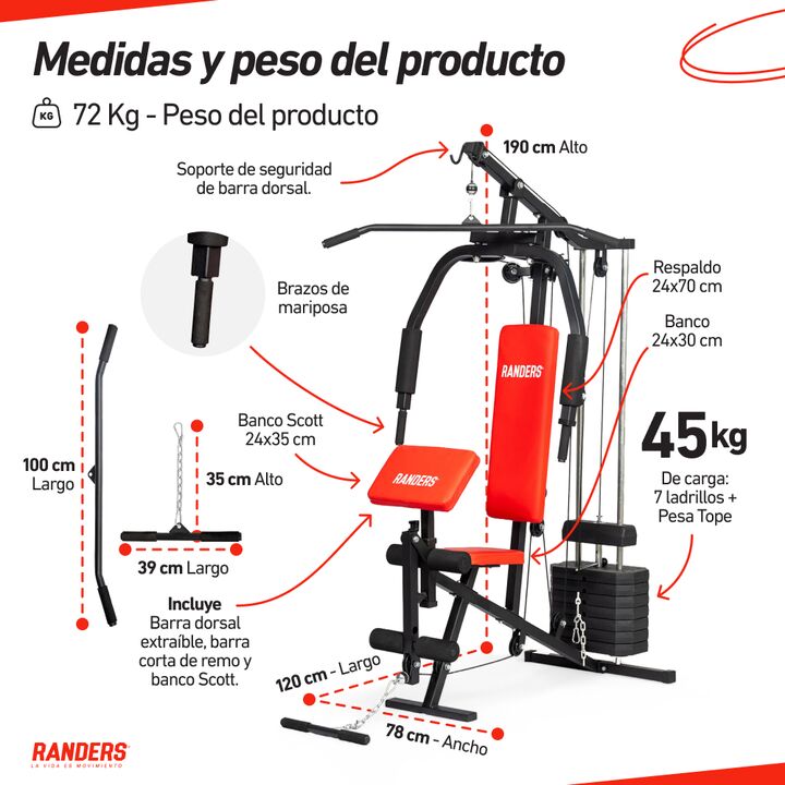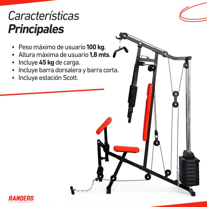 Mutigimnasio ARG-63120 Características principales Tipo: Multigimnasio. Incluye estación Scott. Incluye 45Kg de carga (7 ladrillos + Pesa Tope) Incluye barra dorsalera y barra corta Asientos acolchados de cuero sintético rellenos de espuma de poliuretano Permite realizar una rutina completa de ejerc...