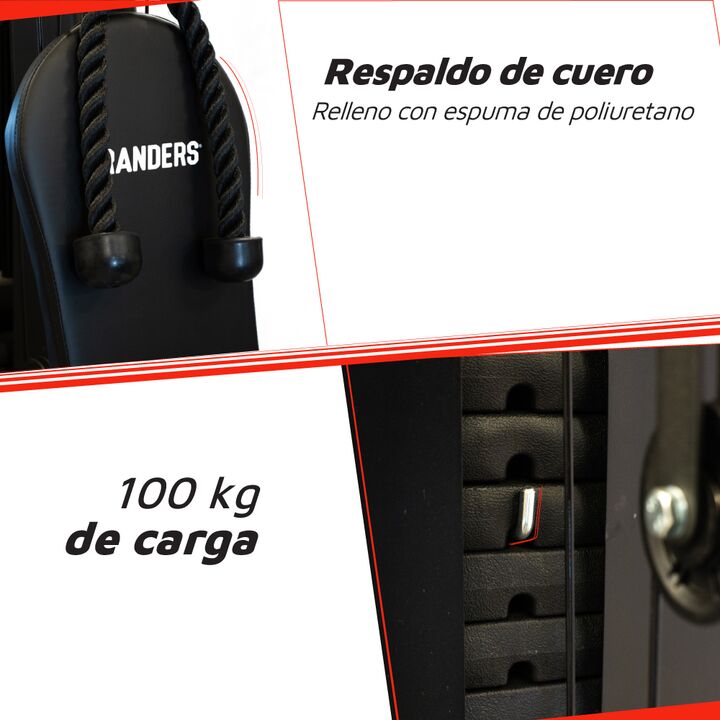 Multigimnasio Randers ARG-63167 CARACTERÍSTICAS PRINCIPALES o Tipo: Multi estación. o Color: Negro. o Peso máximo: 150 Kg. o Músculos: Hombros, Bíceps, Tríceps, Espalda, Pecho, Oblicuo, Cuádriceps, Abductor/Aductor. o Lingotera: 100Kg. o Cobertura de ladrillos. o Se puede utilizar como banco Scott. ...