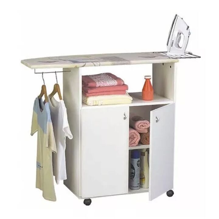 Planchador funcional Rodante Con Perchero Posa plancha rebatible Tela estampada Dimensiones Ancho 107 x Prof 34 x Alto 86 cm Color Blanco El tapizado puede variar según disponibilidad.