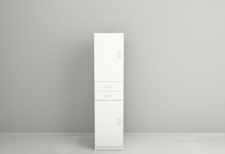 Medidas: Largo 0,45 m - Alto 1,79 m - Profundidad: 0,46 m Cantidad de puertas: 2 Cantidad de cajones: 2 (interior totalmente revestido con la misma melamina) Cantidad de estantes: 2 Manijas de aluminio anodizado Peso: 49 Kg. Sistema Minifix-Correderas metálicas-Bisagras metálicas IMPORTANTE Los mueb...