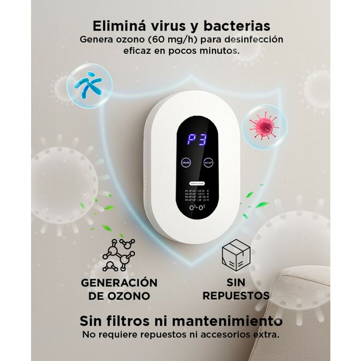 Ozonizador y Purificador de aire portátil para eliminar virus, bacterias y ácaros de ambientes y espacios. Ideal para ahorrar tiempo y procesos de sanitización. Con solo presionar un botón comienza a desinfectar. Diseño minimalista, moderno, super silencioso y fácil de transportar. Modo de uso único...