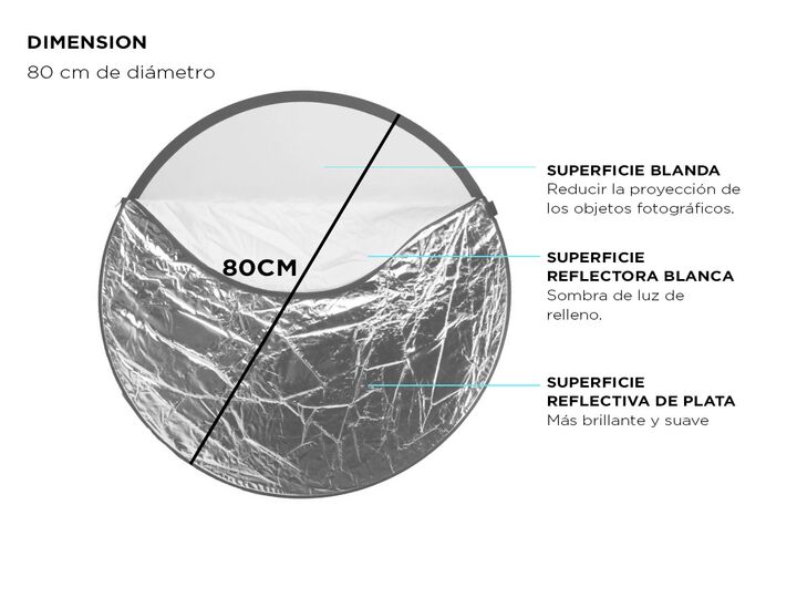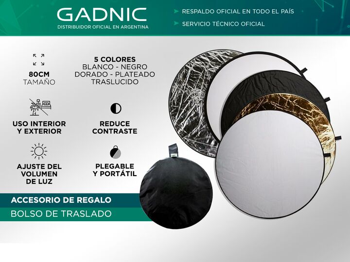 El reflector 5 en 1 de 80 cm es perfecto para obtener fotografías profesionales, ofreciendo una gran versatilidad en el manejo de luz y sombras. Con sus cinco superficies —Oro, Plata, Blanco, Negro y Translúcido—, te permite lograr diversos efectos como difuminar, absorber, reflejar o suavizar la lu...