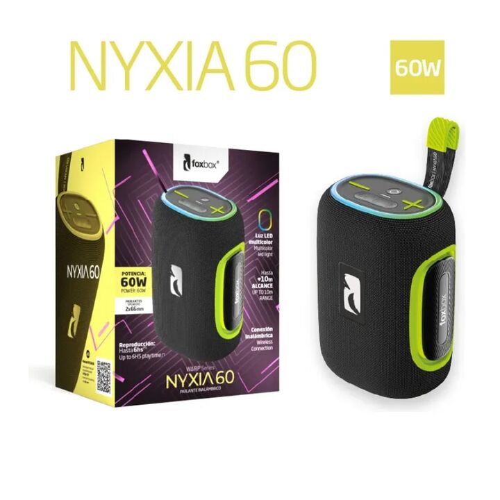 Parlante Foxbox Nyxia 60 Potente Y Compacto Negro Características del producto Con Bluetooth: Sí Con luces LED: Sí Incluye batería recargable: Sí Características generales Marca FoxBox Modelo No identificado Color Negro Voltaje 5V Accesorios Con base No Incluye soporte No Otros Es a prueba de agua N...