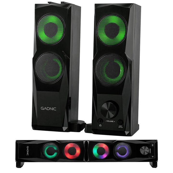 Parlante Gamer RGB Gadnic 2 en 1: Pc y Barra de Sonido Juego de parlante que se pueden utilizar en forma vertical u horizontal simulando una barra de sonido. Compatible con Notebook, Laptop, PC, Celulares, Tablets, MP3, TV Smart, PS4 y cualquier dispositivo que tenga conexión jack 3.5mm. Ideal para ...