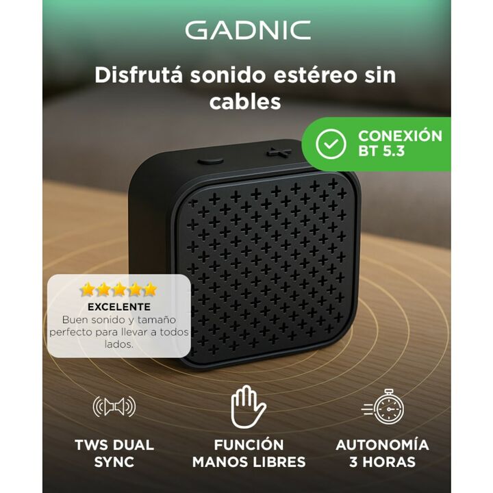 Compacto, moderno y siempre listo: Con solo 8 cm de tamaño, el parlante Gadnic Nextbeat te acompaña a donde vayas. Su diseño resistente y liviano permite llevarlo en el bolsillo, mochila o bolso sin ocupar espacio. Sonido claro y potente: A pesar de su tamaño, ofrece una potencia real de 5W, brindan...