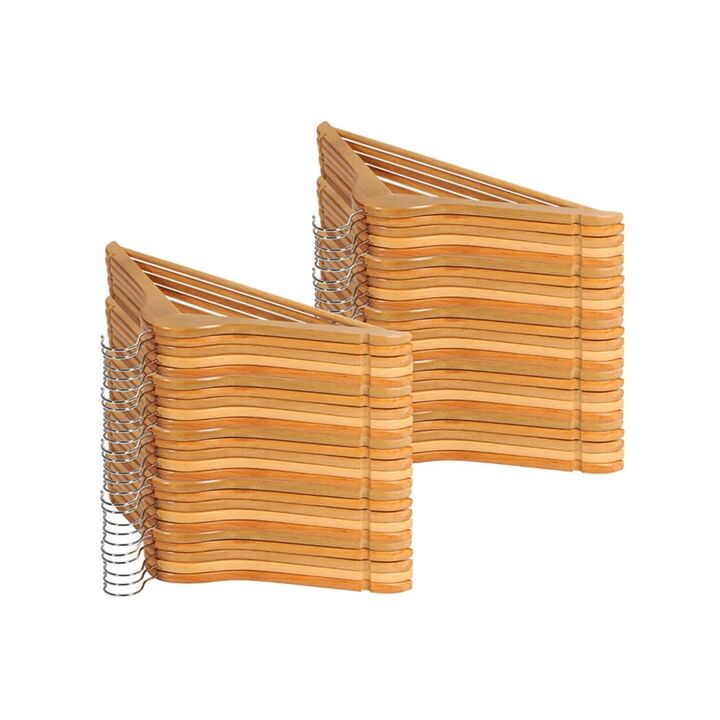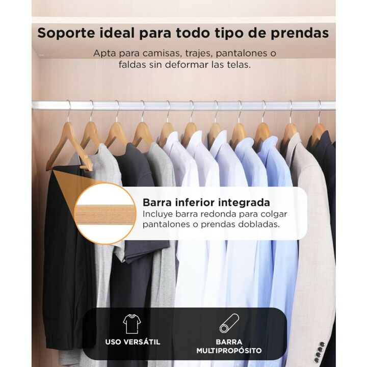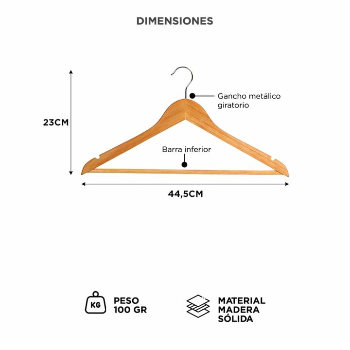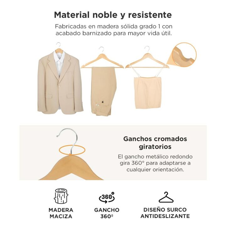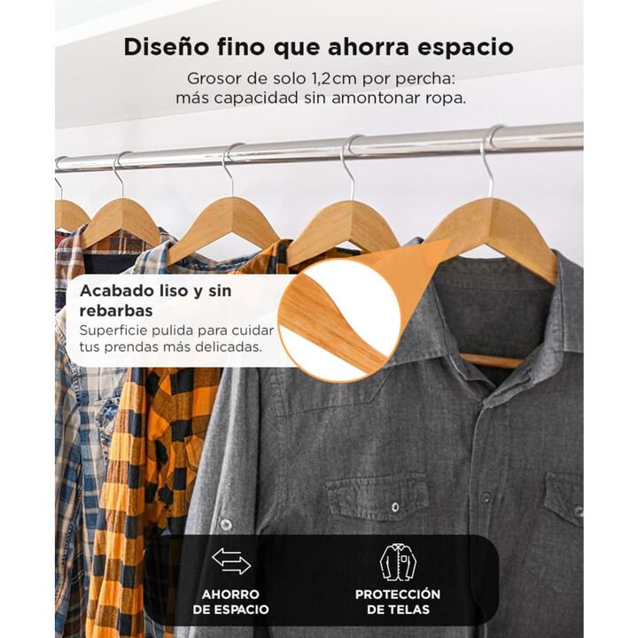 Set completo para máxima organización Incluye 50 perchas de madera natural ideales para optimizar el espacio y mantener tu ropa prolija y sin marcas. Madera sólida con acabado barnizado Cada percha está fabricada en madera grado 1 y tratada con barniz protector que mejora su durabilidad y estética. ...