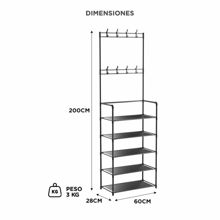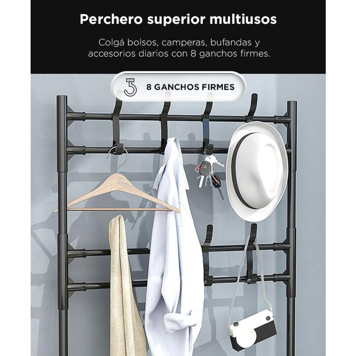 Organización completa en un solo mueble El Perchero Organizador Zapatero Gadnic combina un diseño práctico con una estructura firme para mantener todo en orden. Sus 4 niveles permiten almacenar calzado de forma cómoda y accesible mientras que el sector superior incluye barras y ganchos para ropa, bo...