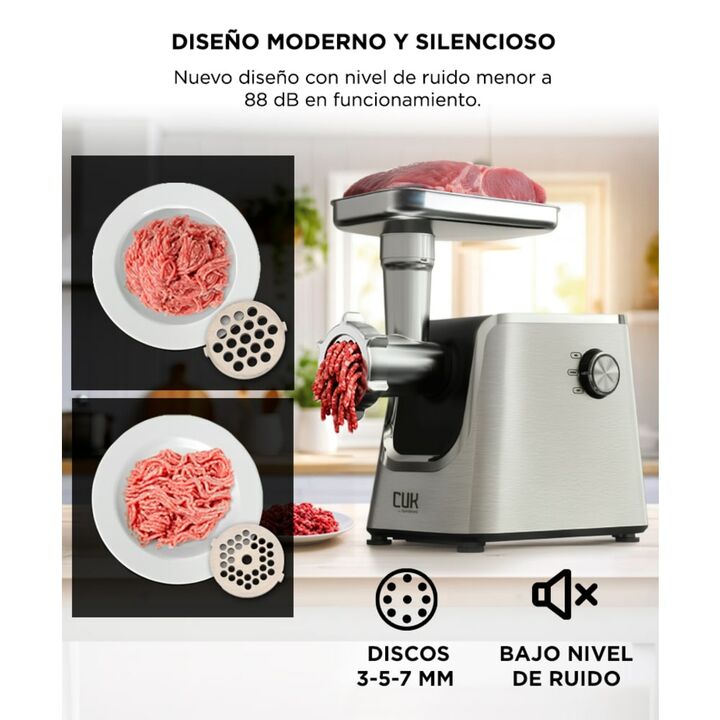 Picado rápido y potente para uso doméstico intensivo La picadora de carne eléctrica MG5023-GS está pensada para quienes buscan mayor potencia y velocidad al cocinar en casa, permitiendo procesar grandes cantidades de carne en menos tiempo. Motor de alto rendimiento con potencia de bloqueo Cuenta con...
