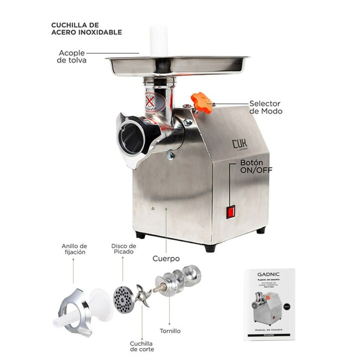¡Nueva Picadora De Carne Industrial Gadnic Big - P! El cuerpo está hecho completamente de acero inoxidable y tratado con cepillado mate. También equipado con cabezal totalmente de acero y bandeja de acero inoxidable. Adopta un potente motor de 1 HP, que proporciona una velocidad de rotación de 170 r...