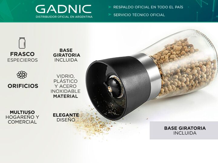 ¡Nuevo Molinillo de pimienta/sal Gadnic! Llenos de pimienta o sal, los molinillos se encargan de que sus platos se sazonen a la perfección. El molinillo de acero inoxidable ajustable es excelente para moler cada grano del mismo tamaño. Especificaciones Molinillo de pimienta/sal manual Tamaño del pro...