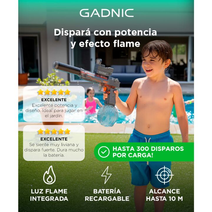 Disparo automático recargable: Con batería de 500 mAh, ofrece disparos continuos por 45 minutos sin esfuerzo manual. Efecto de luz flame integrado: Simula una llama luminosa al disparar, brindando un efecto visual divertido y único. Gran capacidad de agua: Depósito de 425 ml para más tiempo de juego...