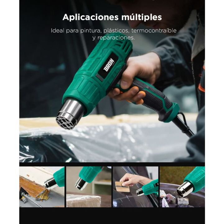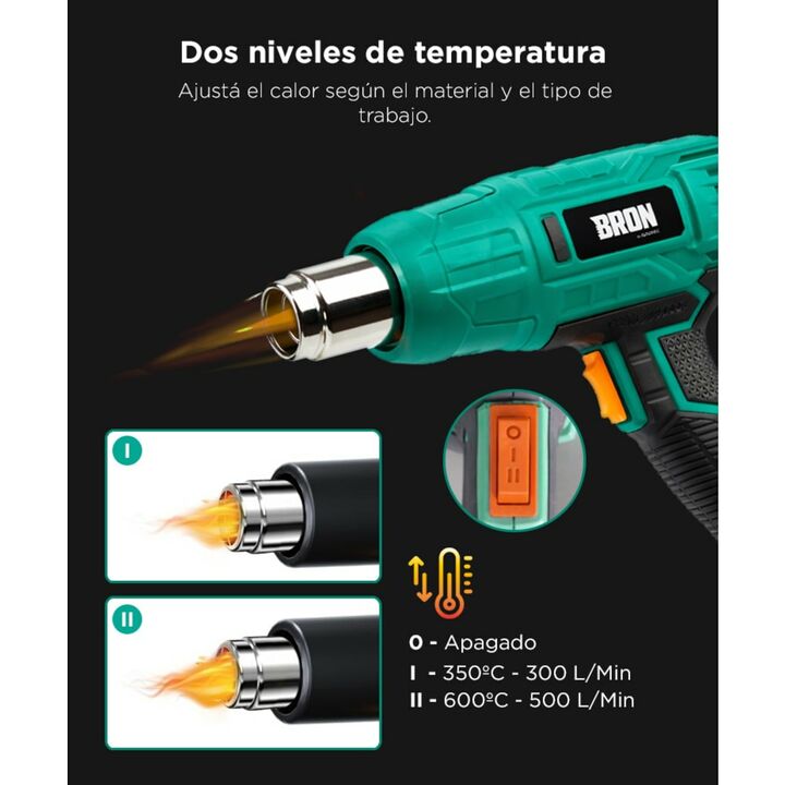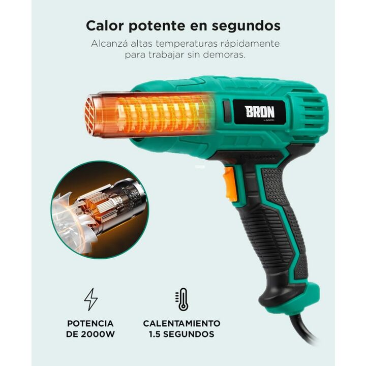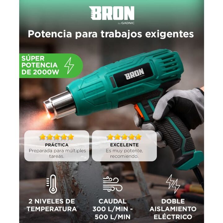Potencia de 2000W para trabajos exigentes: La pistola de calor Gadnic BRON 2000W ofrece la potencia necesaria para remover pintura, moldear plásticos y aplicar termocontraíbles. Permite trabajar con rapidez y resultados uniformes en múltiples aplicaciones. Doble nivel de temperatura para mayor contr...