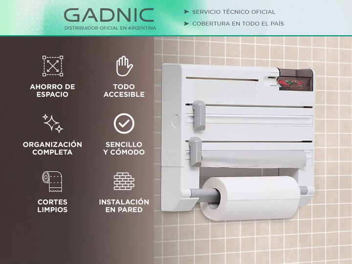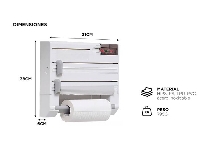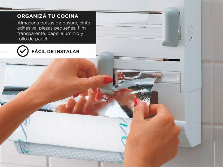 Organiza tu cocina de manera eficiente con este portarrollo multifuncional, diseñado para ahorrar espacio y mantener todo a tu alcance. Este práctico accesorio no solo sostiene el papel de cocina, sino que también te permite almacenar bolsas de basura, cinta adhesiva, piezas pequeñas, film transpare...
